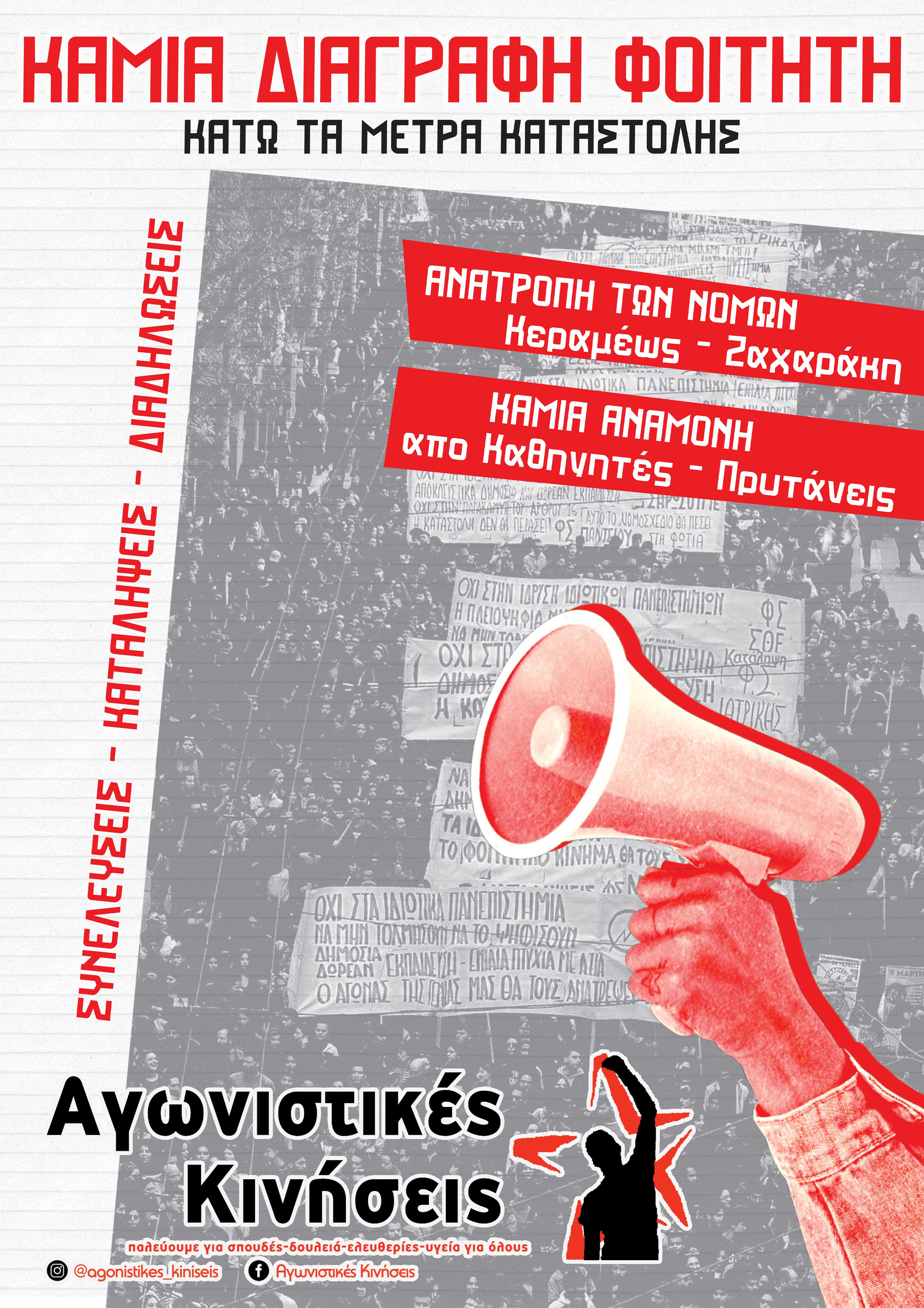 Καταγγέλλουμε κάθε συνεργασία των πανεπιστημίων μας με το μαντρόσκυλο των ΗΠΑ και απαιτούμε άμεση απεμπλοκή της χώρας από τα ιμπεριαλιστικά σχέδια και μέτωπα. Εμπνεόμενοι από τον ηρωικό αγώνα της Παλαιστινιακής Αντίστασης, αλλά και τα κινήματα των λαών, τασσόμαστε ενάντια σε πόλεμο και ιμπεριαλισμό, ΣΤΟ ΠΛΕΥΡΟ ΤΩΝ ΛΑΩΝ!