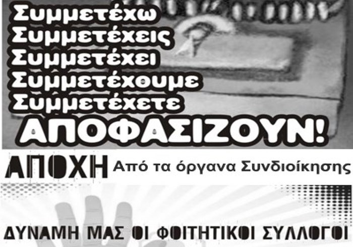 - Ο θεσμός της συνδιοίκησης είναι μαύρος και αντιδραστικός, θέλει να ενσωματώσει το φοιτητικό κίνημα στον διοικητικό μηχανισμό των πανεπιστημίων. Θέλει τους φοιτητές να βάζουν την υπογραφή τους σε όλα τα μέτρα του Υπουργείου, και ύστερα το Υπουργείο να τα παρουσιάζει ως “κοινή απόφαση φοιτητών και καθηγητών”. Μετατρέπει τους φοιτητές σε συνυπεύθυνους στην αντιλαϊκή πολιτική της κυβέρνησης.