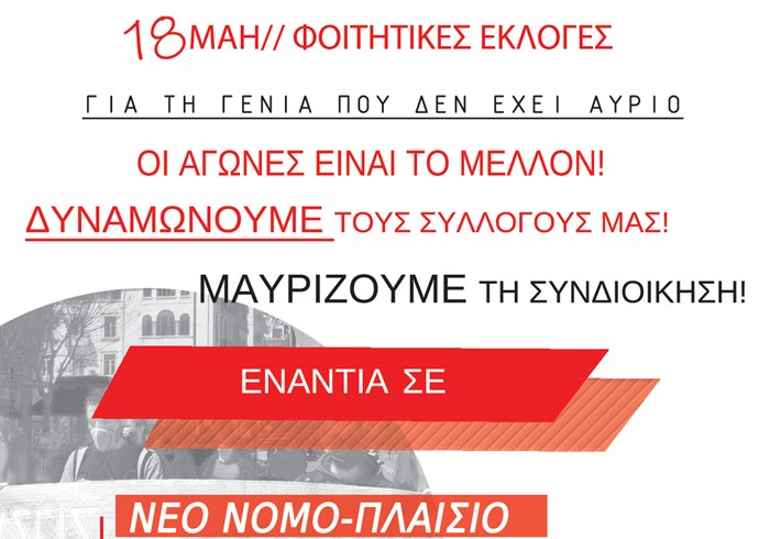 Στις 18 Μαΐου στηρίζουμε-ψηφίζουμε τη φωνή της αντίστασης και της διεκδίκησης, της ανεξαρτησίας των φοιτητικών συλλόγων από το κράτος και τους μηχανισμούς “συνδιοίκησης”, της αντιπολεμικής-αντιΐμπεριαλιστικής πάλης. ΣΤΗΡΙΖΟΥΜΕ-ΨΗΦΙΖΟΥΜΕ ΑΓΩΝΙΣΤΙΚΕΣ ΚΙΝΗΣΕΙΣ!
